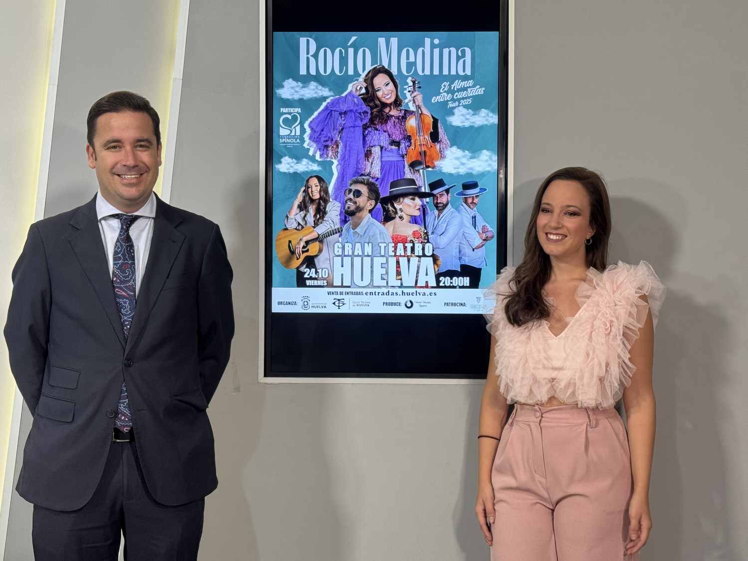 El concejal de Cultura y Patrimonio Arqueológico, Nacho Molina; junto a la violinista Rocío Media, han presentado esta mañana el concierto que la artista almonteña ofrecerá el próximo viernes 24 de octubre en el Gran Teatro. Con un espectáculo completamente renovado, tal y como han anunciado, la joven estará acompañada en el escenario por María Carrasco, Juanlu Montoya, Erika Leiva, los Tamborileros de Almonte y un coro infantil de niños y niñas del Colegio Cardenal Espínola de Huelva, “mucho arte de la tierra el que se va a subir a las tablas del Gran Teatro, así que yo no me lo perdería”, ha afirmado el concejal.