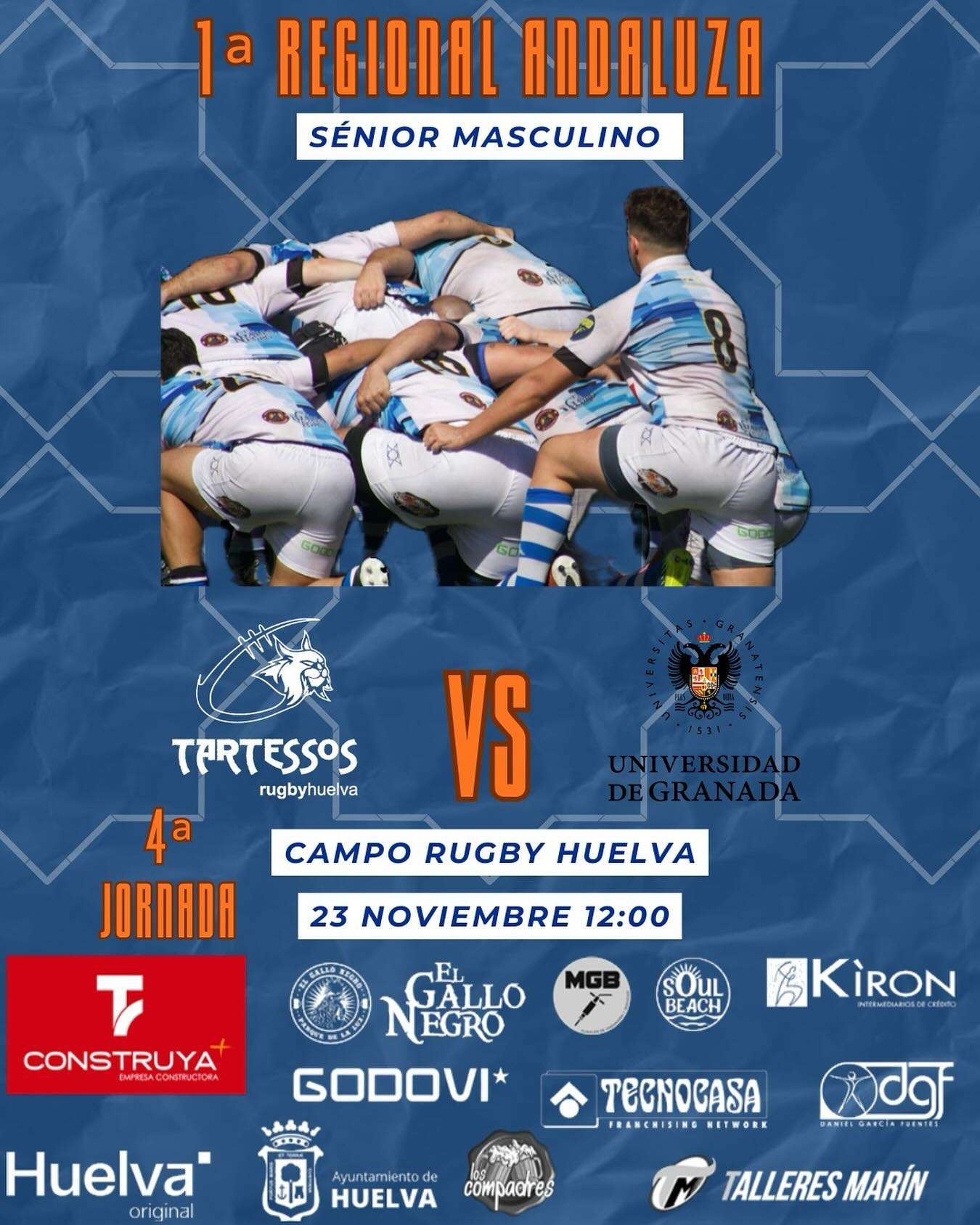 Este domingo 23 de noviembre, a las 12:00, el CR Rugby Tartessos se enfrentará al Universidad de Granada B, en la Liga BMS, de la 1ª Territorial Masculino XV, en el campo de rugby onubense, situado junto al Parque Juan Duque, en la capital, con entrada gratuita.