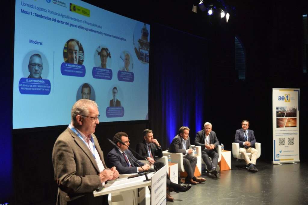 En la apertura de la jornada han intervenido el presidente del Puerto de Huelva, Alberto Santana y el presidente de la Asociación Española de Transporte (AET), Juan Manuel Martínez.