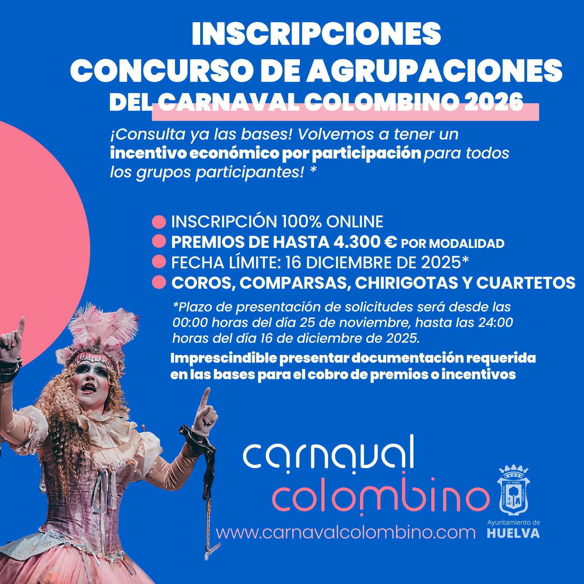 Huelva, 25 noviembre de 2025 – El Carnaval Colombino ha abierto oficialmente el plazo de inscripción para el Concurso de Agrupaciones 2026, uno de los certámenes carnavalescos más emblemáticos de Andalucía. Desde el 25 de noviembre y hasta el 16 de diciembre de 2025, los grupos interesados podrán formalizar su participación de forma completamente online.