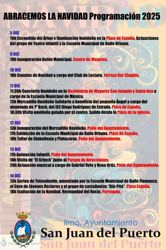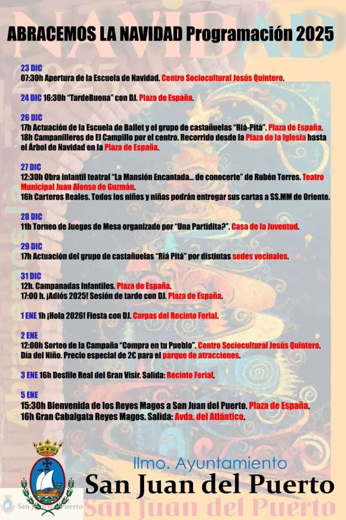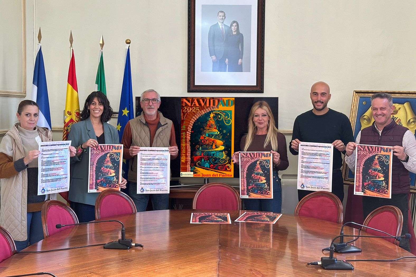 El Ayuntamiento de San Juan del Puerto ha presentado hoy la programación “Abracemos la Navidad 2025”, una propuesta festiva que convierte al municipio en punto de referencia provincial durante las fechas navideñas. Música, teatro, actividades infantiles, encuentros vecinales, talleres, visitas guiadas y espacios solidarios conforman una agenda diseñada para que la población disfrute de un diciembre repleto de ambiente navideño, cultura y convivencia.