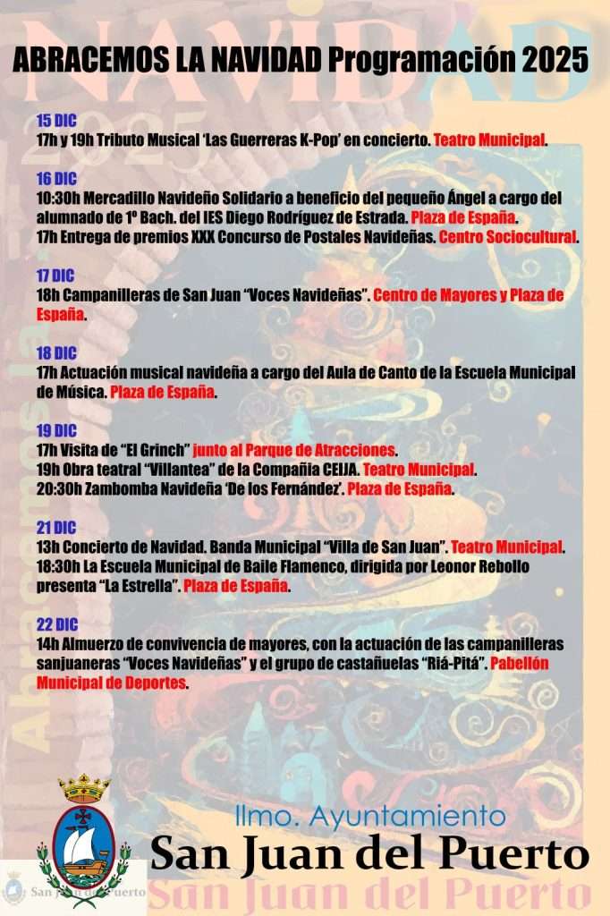 La alcaldesa Rocío Cárdenas ha destacado el carácter abierto y participativo de la programación “queremos que cada vecino y vecina sienta esta Navidad como propia. San Juan del Puerto se transforma en estas fechas y lo hace gracias a su gente, a su alegría y a su compromiso. Invitamos a toda la población a salir a la calle, compartir, disfrutar y vivir intensamente estas semanas que celebran lo mejor de nosotros como pueblo”.