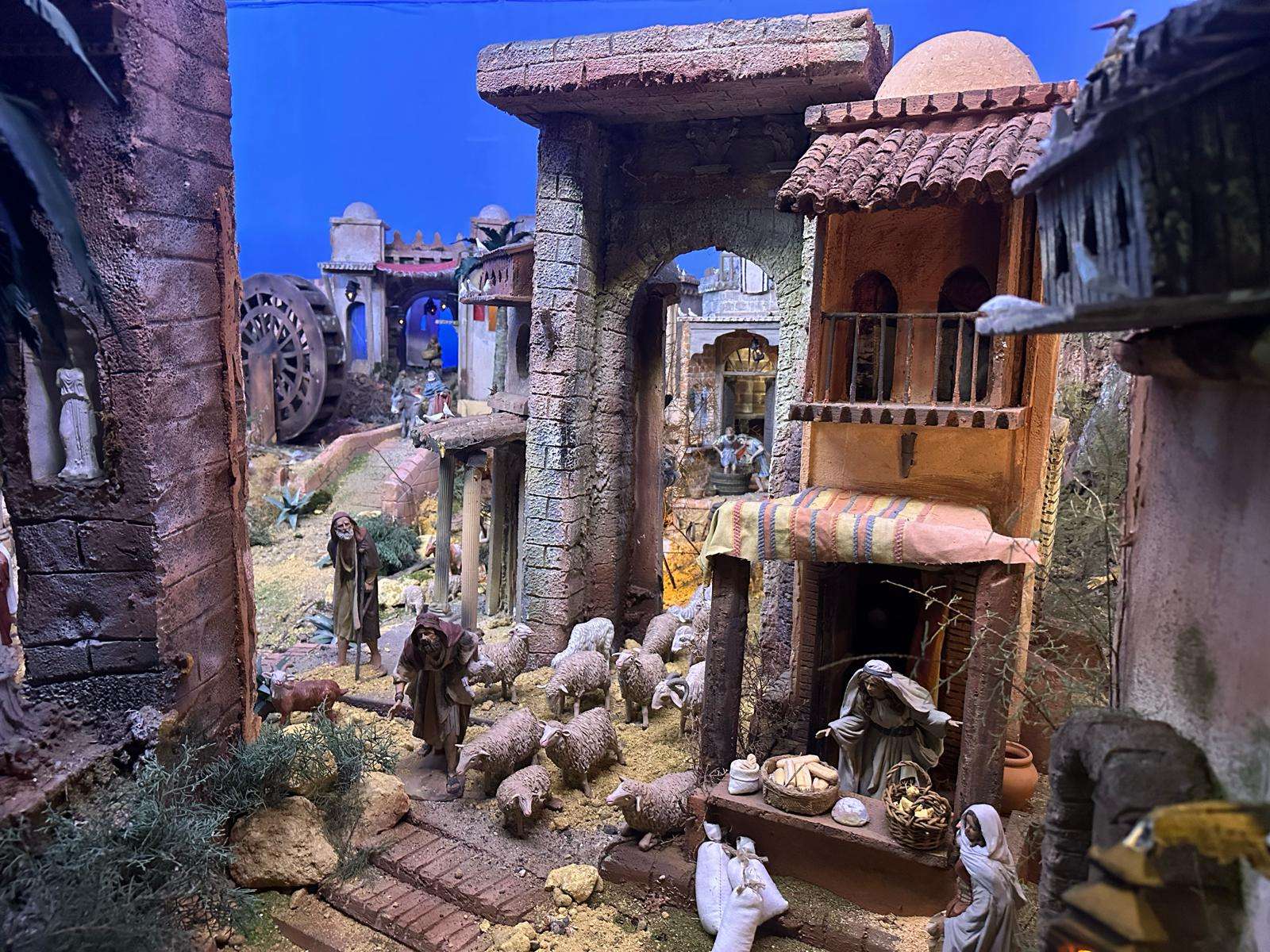 El nacimiento, de estilo tradicional bíblico, vuelve a destacar por su cuidada elaboración en torno a escenas que realizan un recorrido narrativo por la ciudad de Belén y el poblado de Nazaret, lugar donde discurre la infancia de Cristo tal y como marca la tradición de los belenes de misterio.