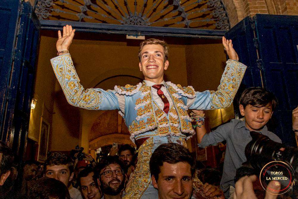 6º “Desgastado”. Carlos Tirado. Voltereta fuerte la que se pegó el sexto novillo de la tarde en el recibo capotero de Carlos Tirado, que le bajó muchos las manos. Con cuantioso temple lo pasó de muleta Tirado, al que puso la pañosa por delante, no dejándole pensar sino perseguir la tela roja. El novillero de Ayamonte le corrió la mano muy despacio, sin tirones, acariciando la embestida de su antagonista. Muy entregado Carlos Tirado, improvisando en la cara del novillo, disfrutando en un día tan especial para él, con cabeza también, jugando con los terrenos más apropiados para sacarle el máximo partido. Nuevamente no le funcionaron los aceros al joven torero ayamontino. Palmas tras dos avisos.