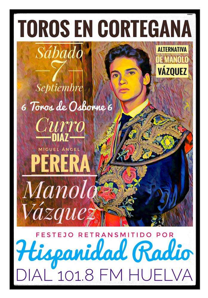 La plaza de toros de Cortegana (Huelva) ha registrado en el día de hoy -7 de septiembre-, una entrada de lleno en una tarde en la que Manolo Vázquez ha tomado la alternativa de manos de Curro Díaz, como padrino, teniendo como testigo de ceremonias a Miguel Ángel Perera.