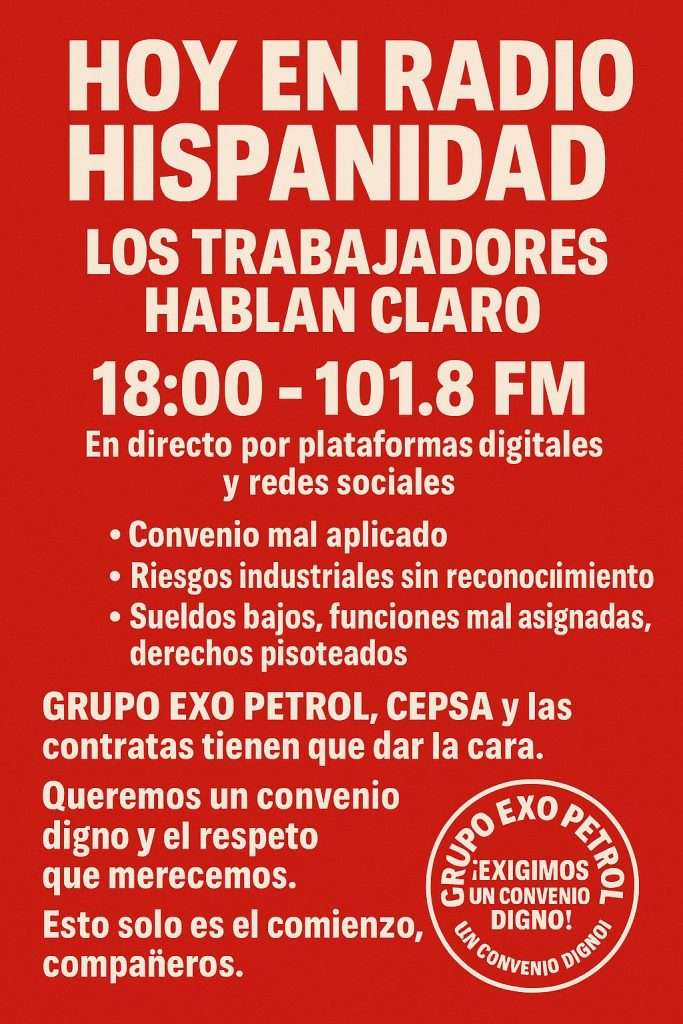 Hoy recibimos en la emisora a Javier Ferrer, Juan Carlos Lobato y Antonio García, trabajadores del Servicio de Limpieza Industrial de Cepsa Refinería La Rábida, subrogados por la Empresa «Grupo Exo Petrol». Conocimos la situación laboral que viven hace tiempo, una situación que afecta a su salud laboral y a sus condiciones de trabajo, ya que el Convenio de «Limpieza de Edificios y Locales» que les aplican no corresponde ni a las funciones reales, ni a las sustancias que manipulan. Dimos voz a sus reivindicaciones.