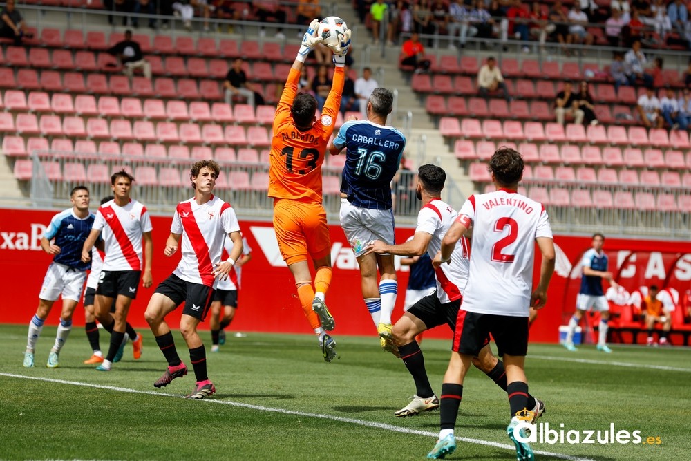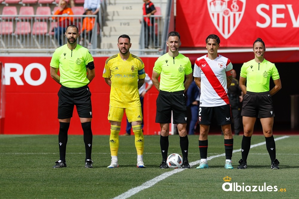 Los últimos minutos de la primera mitad estuvieron marcados por la polémica. Una acción en el área de Rubén Gálvez, en la que el colegiado quiso pitar la pena máxima, que terminó en tangana entre los jugadores sevillistas y los albiazules, con tarjeta amarilla para el guardameta del Decano y para Carlos Álvarez.